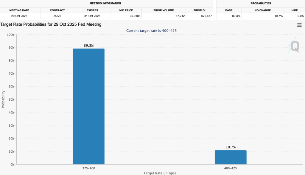 Expectations of an interest rate cut by The Federal Reserve is one of the important catalysts this month. According to the CME FedWatch Tool, the probability of the Fed cutting interest rates in October stands at 89.3%. With lower interest rates, investors are likely to abandon bonds and other safe assets and move into riskier assets such as Bitcoin (BTC) and altcoins.