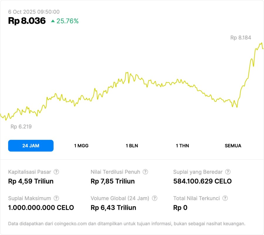 Jakarta, Pintu News â Based on CoinGecko data as of October 6, 2025 at 09:50 WIB, the price of Celo was recorded at IDR 8,036, an increase of 25.76% in the last 24 hours. The highest price was reached at Rp8,184, while the lowest price in the same period was Rp6,219.