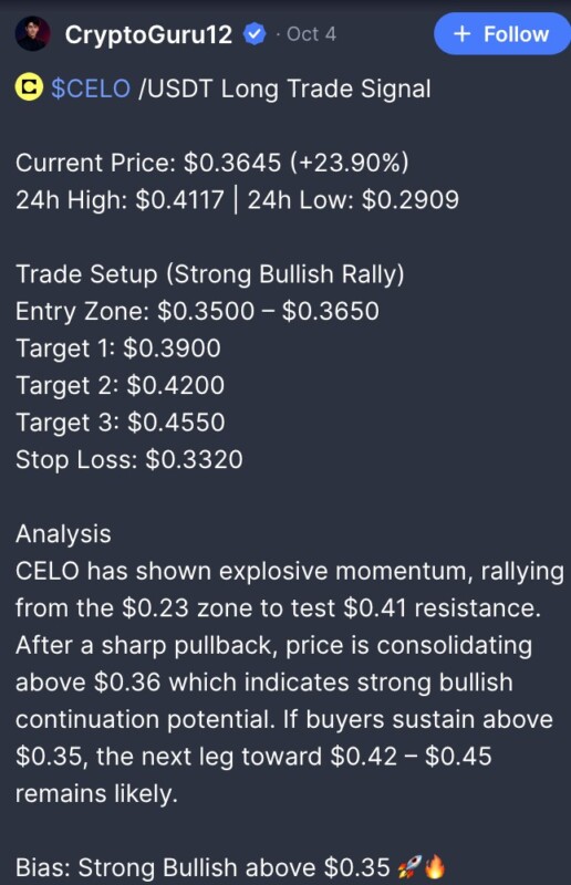 In his trading signal on X (Twitter) dated October 4, 2025, CryptoGuru12 noted that the price of CELO has risen from $0.23 (Rp3,817) to $0.41 (Rp6,804) and is now testing a major resistance level. If the price is able to hold above $0.35 (IDR5,809), then the potential for an increase towards the next target at $0.42-$0.45 (IDR6,971-IDR7,468) is still wide open.
