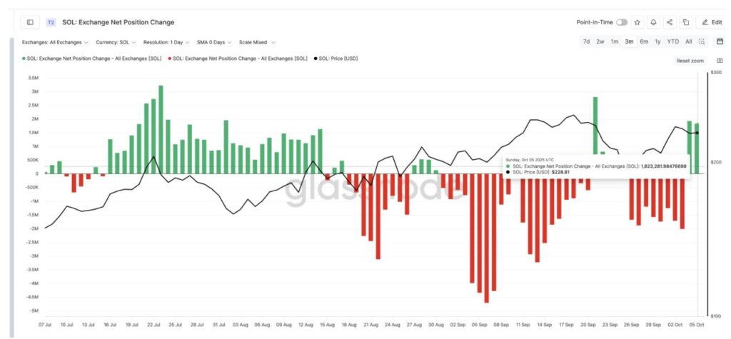 Beberapa pelaku pasar mulai melakukan aksi ambil untung. Data exchange net position change Solana — yang mengukur selisih antara jumlah koin yang masuk dan keluar dari bursa terpusat — berubah dari –2,01 juta SOL pada 3 Oktober menjadi +1,82 juta SOL pada 5 Oktober.