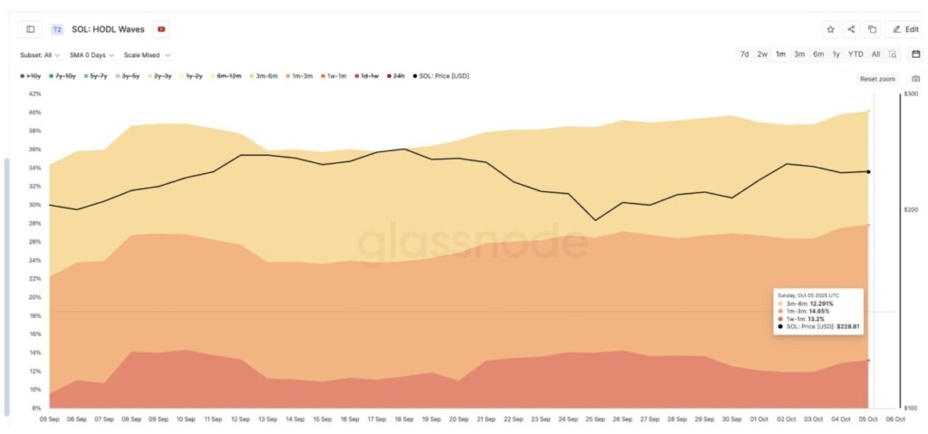 Namun, tekanan jual ini diimbangi oleh keyakinan holder jangka menengah. Berdasarkan data HODL Waves dari Glassnode, yang melacak berapa lama koin tidak berpindah, terlihat adanya peningkatan akumulasi dari holder jangka pendek hingga menengah: