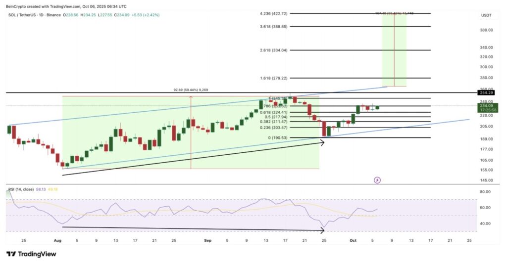 Sementara itu, indikator Relative Strength Index (RSI) menunjukkan adanya divergensi bullish tersembunyi. Antara Agustus hingga akhir September, harga Solana membentuk higher low, sementara RSI membentuk lower low. Pola ini biasanya menandakan bahwa tren naik masih memiliki kekuatan tersembunyi di balik pergerakan harga.