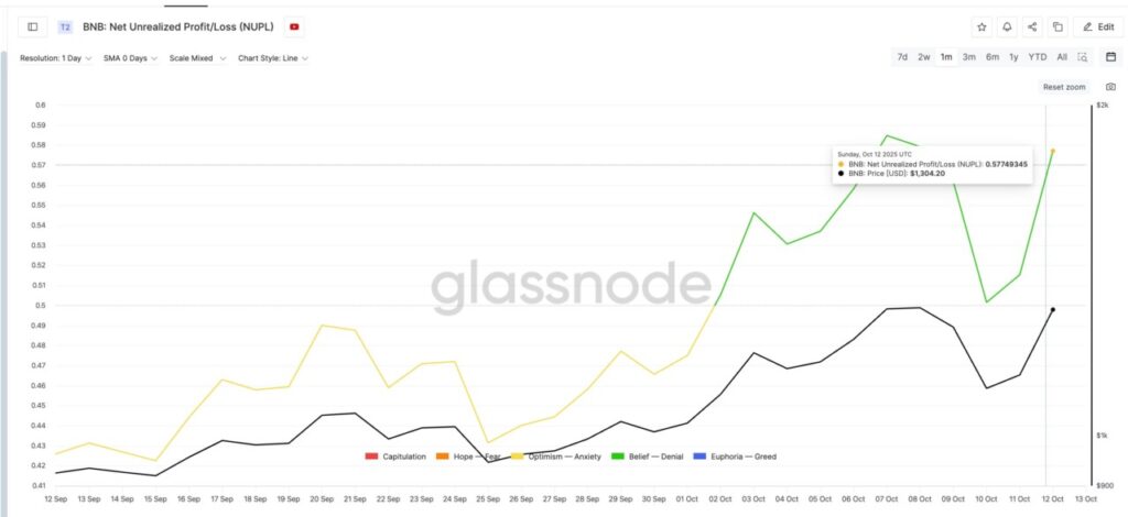 Based on data from Glassnode quoted by BeInCrypto on October 13, 2025, the Net Unrealized Profit/Loss (NUPL) metric for BNB is now at the level of 0.57. This figure shows that most investors are currently in a state of “unrealized profit” or have not realized their profits.