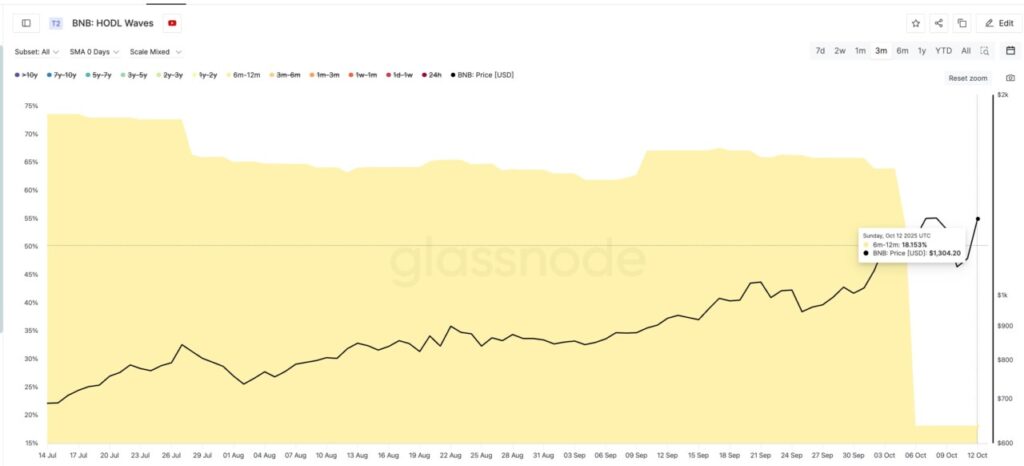 The next important signal came from the HODL Waves metric, which shows the age distribution of token holdings. The latest data reveals that the group of BNB holders over 6-12 months-which usually anchors the medium-term bullish trend-is experiencing a significant decline.