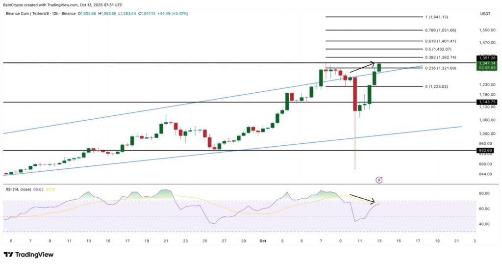 From a technical perspective, the Relative Strength Index (RSI) also shows a clear bearish divergence signal. BNB’s RSI formed a lower high, while BNB’s price formed a higher high between October 10-12. This is a classic pattern that usually precedes a short-term correction.