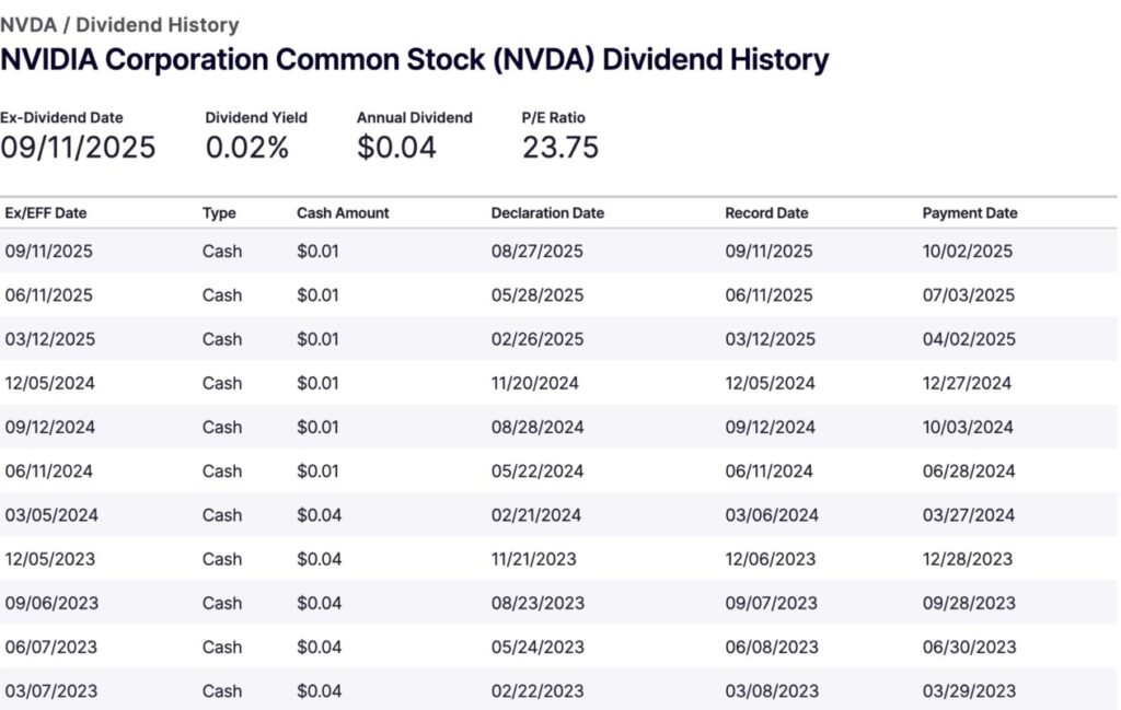 If you’re asking, “what is NVIDIA’s dividend per share?”, then the answer in 2025 is $0.04 (about Rp662 at an exchange rate of Rp16,553/USD). This amount is divided into four quarterly payments of $0.01 each, as noted on the ex-dividend dates of September 11, June 6, and March 12, 2025.