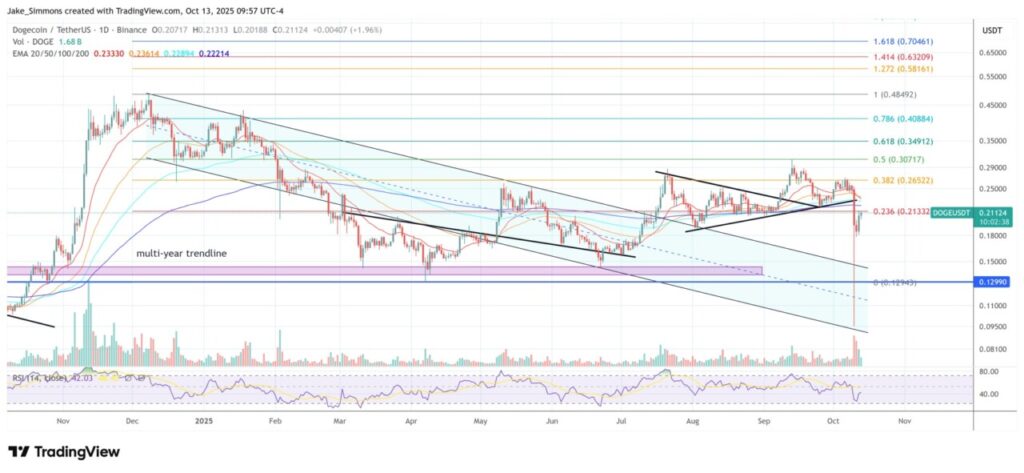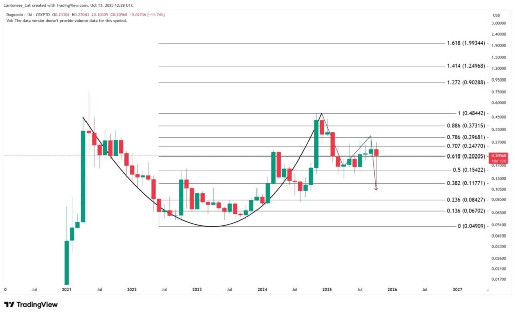 Jakarta, Pintu News – While the crypto market is experiencing a lot of liquidation and fear, there is one chart pattern on Dogecoin that many traders seem to have missed. The crypto analyst known as Cantonese Cat points out that Dogecoin’s (DOGE) monthly structure is still forming the ‘handle’ part of a larger ‘cup and handle’ formation, which has been developing since 2021.