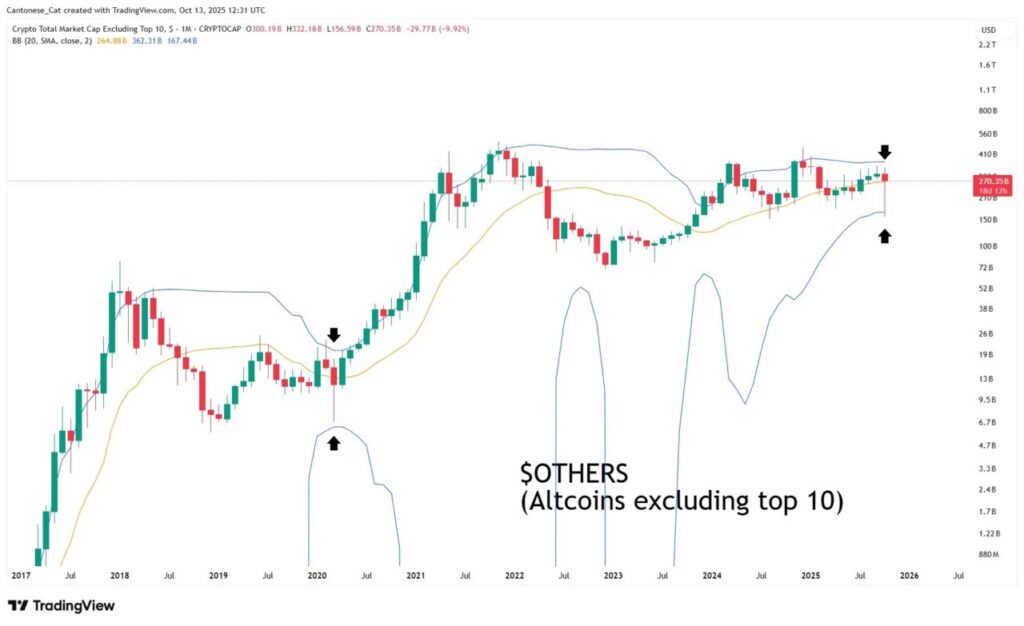 Despite the sharp price fall among altcoins on Friday, Cantonese Cat argues that there was no significant technical breakdown. His analysis shows that the wick ‘handle’ has reached the logarithmic Fibonacci level of 0.382 before bouncing and holding at the 0.618 retracement level as support.