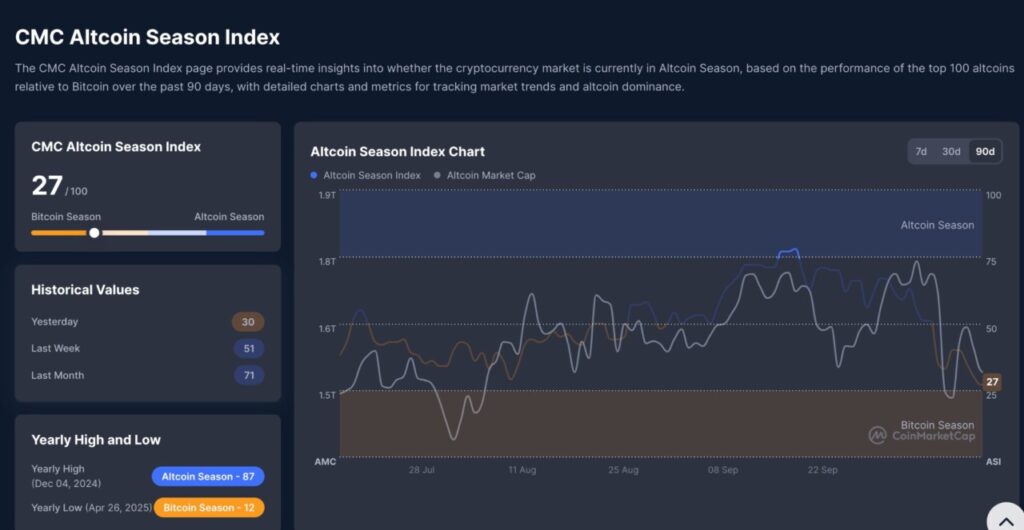 According to CoinMarketCap data the Altcoin Season Index is now at 27, close to Bitcoinās dominance zone. But when compared to last week, there was a sharp drop from a score of 51, suggesting that altcoins have recently undergone a profit-taking phase after a significant rally.