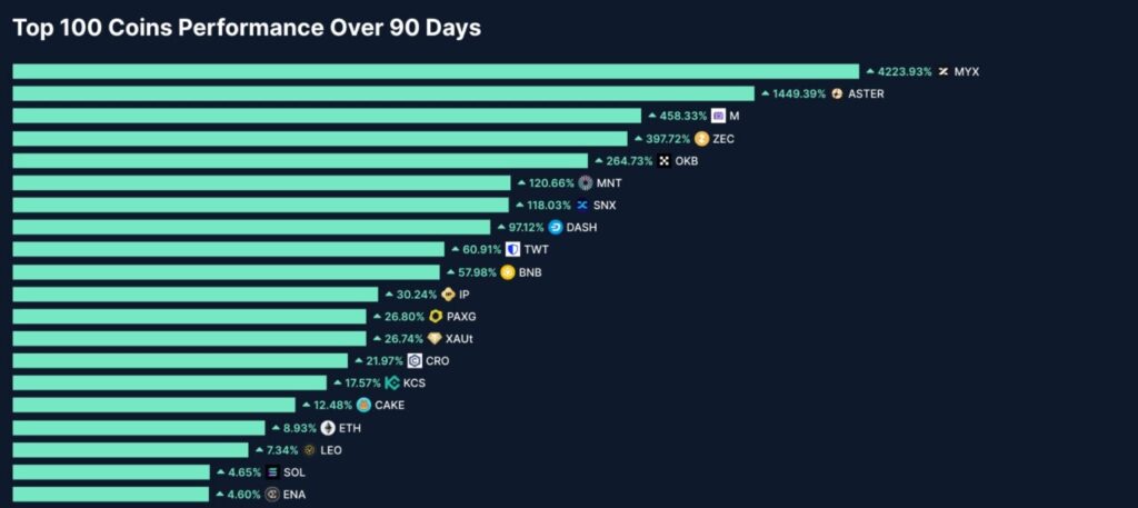 Although the Altcoin Season Index is currently in the āBitcoin Seasonā zone, the performance of altcoins in the last 90 days-especially in the last 7 days-shows that altcoins are still highly attractive to aggressive traders. With extreme moves like MYX rising over 4,000%, this trend is worth monitoring more closely in the next few weeks.