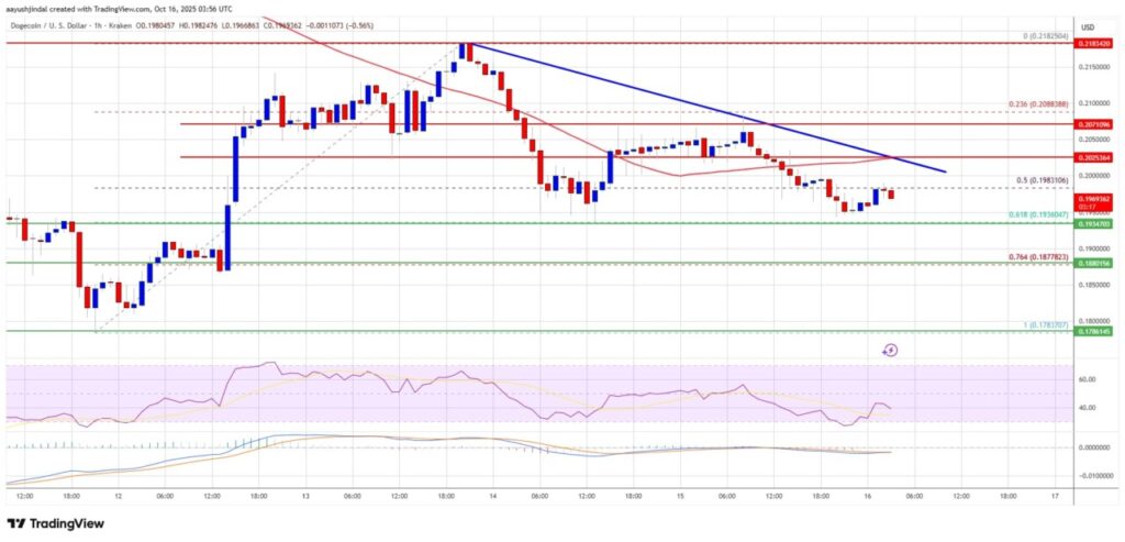 Initial support on the downside is near $0.1930, which is the 61.8% Fib retracement level of the move up from $0.1788 to $0.2182. The next major support is near $0.1880. If the price manages to break below the key support at $0.1800, the DOGE may see a deeper drop. In that scenario, the price could slide towards $0.1665 or even $0.1650 in the near term.