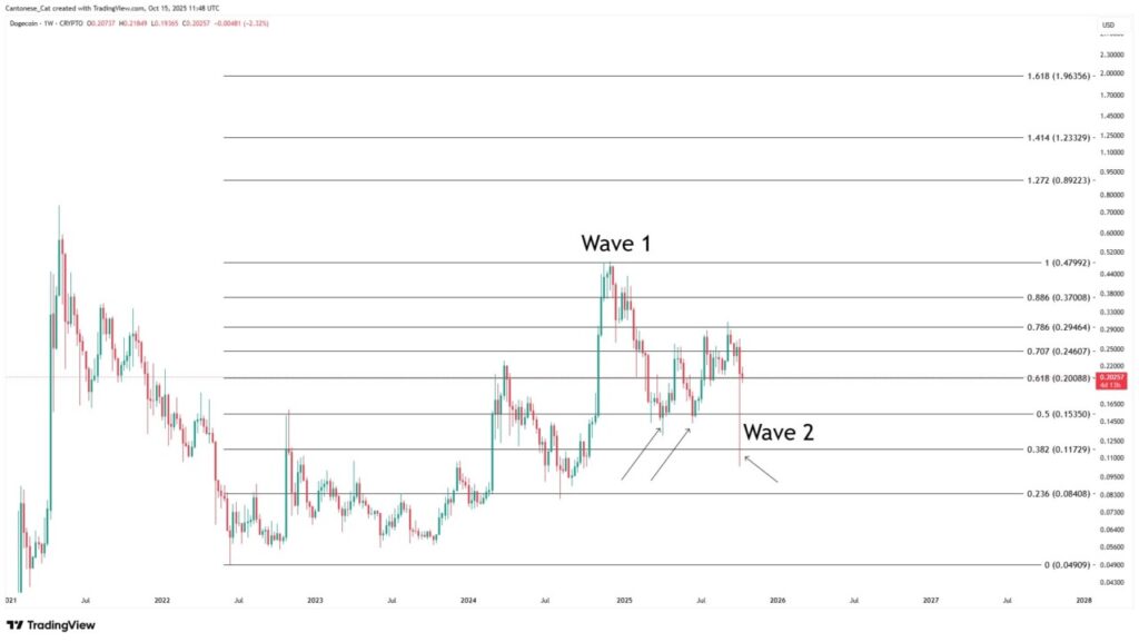According to Cantonese Cat, Dogecoin has managed to reclaim critical Fibonacci levels and seems to be moving from corrective price action to a new impulsive phase. “Initially I thought DOGE’s wave 2 retreated to 0.5 from wave 1, which is valid, but it turned out to reach 0.382 which is also possible for a wave 2 retracement,” he explained. Now, by reclaiming the 0.618 level, there are strong indications that wave 3, known as the most bullish and powerful wave, could have started.