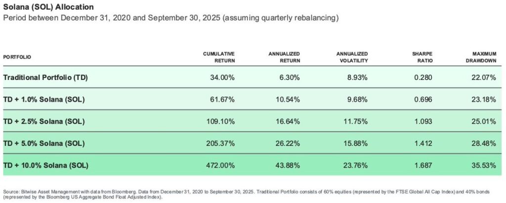 Research shows that by adding just 1% exposure to Solana (SOL), annualized returns can increase to 10.54% with a Sharpe ratio of 0.696. When the allocation was increased to 2.5%, returns jumped to 16.64% with the Sharpe ratio reaching 1.093.