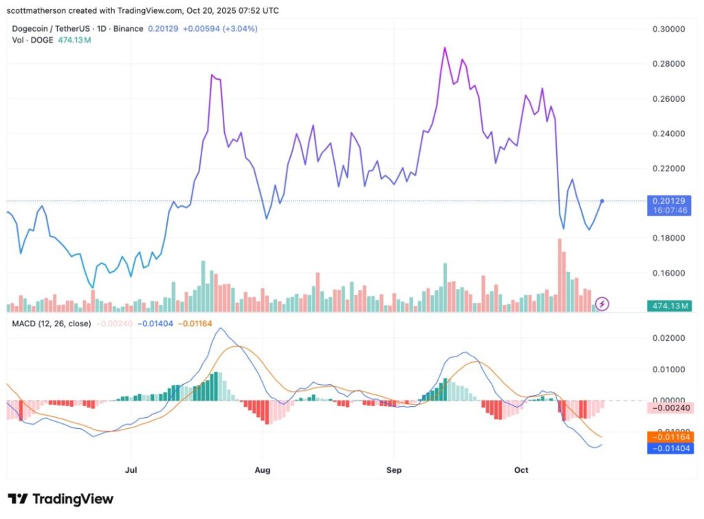 Currently, the Dogecoin price is trading around $0.20, up more than 5% in the last 24 hours according to data from CoinMarketCap. This rise suggests a potential rebound is possible in the near future, especially if Dogecoin continues to hold critical support above the $0.18 level.