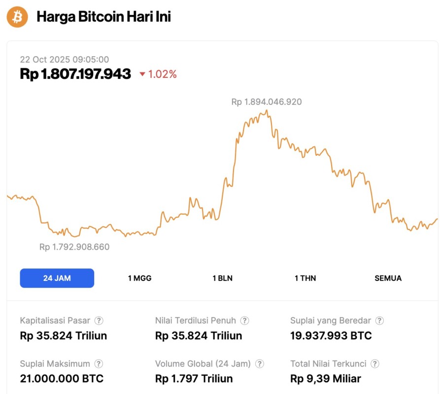 On October 22, 2025, Bitcoin was priced at $108,557, equivalent to IDR 1,807,197,943, reflecting a 1.02% decline over the past 24 hours. During this period, BTC hit a low of IDR 1,792,908,660 and reached a high of IDR 1,894,046,920.