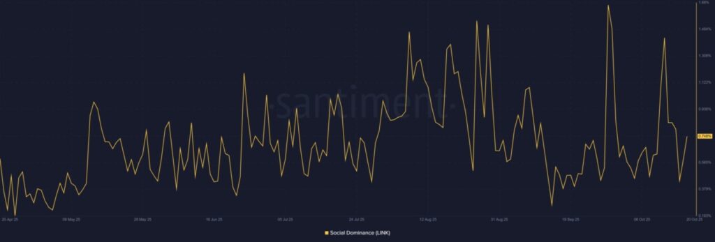 Data from Santiment shows that Chainlink’s social dominance has risen to 0.74%, signaling that market discussions regarding LINK are gradually increasing. This rise indicates a healthy resurgence of community interest, not just momentary hype. The rise in social dominance during the accumulation phase reinforces the bullish setup as awareness and engagement increase liquidity flow.