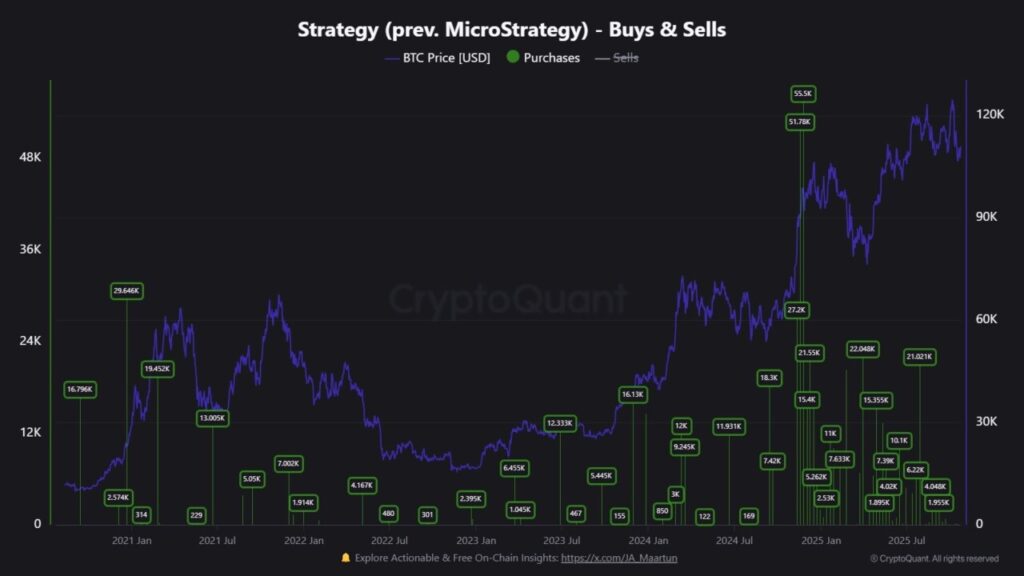 On October 26, CryptoQuant analyst J. Maartunn reported a sharp decline in weekly Bitcoin (BTC) purchases by MicroStrategy. While the company used to buy tens of thousands of Bitcoin (BTC) every week at the end of 2024, the number has now dropped to around 200 Bitcoin (BTC) per week.