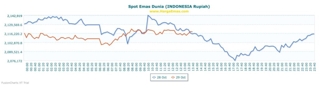 Based on the World Gold Spot chart in Rupiah from HargaEmas.com, the movement of gold prices on October 28 and 29, 2025 shows a fluctuating pattern. At the beginning of the day, the price had moved flat in the range of IDR 2,102,000 per gram, before finally rising to a daily peak above IDR 2,118,000 per gram towards noon.