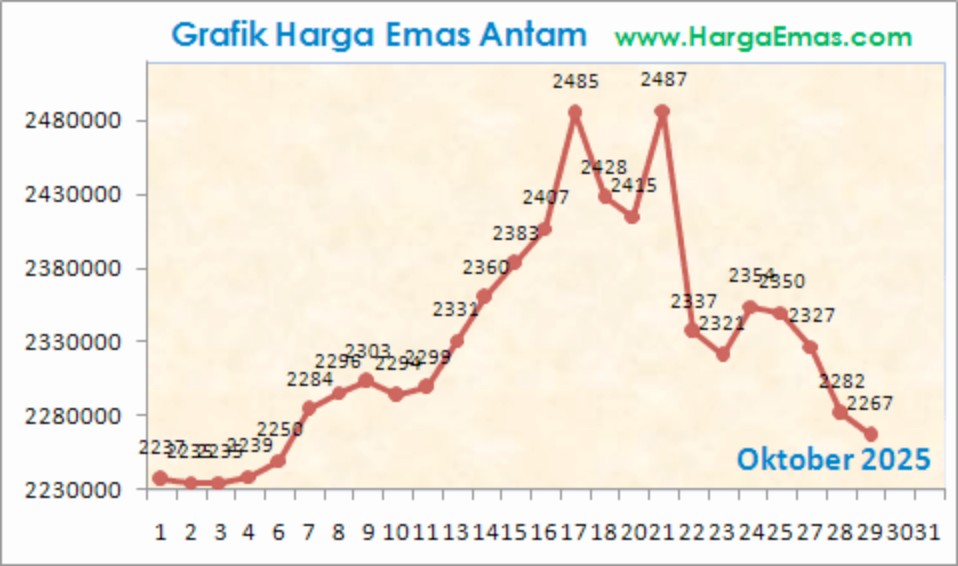 If you look at the historical data of Antam gold prices during October 2025, the price trend shows a fairly sharp up-and-down pattern. Based on the monthly chart from HargaEmas.com, the price peaked at IDR 2,487,000 per gram in the middle of the month, before dropping gradually to IDR 2,267,000 per gram towards the end of October.