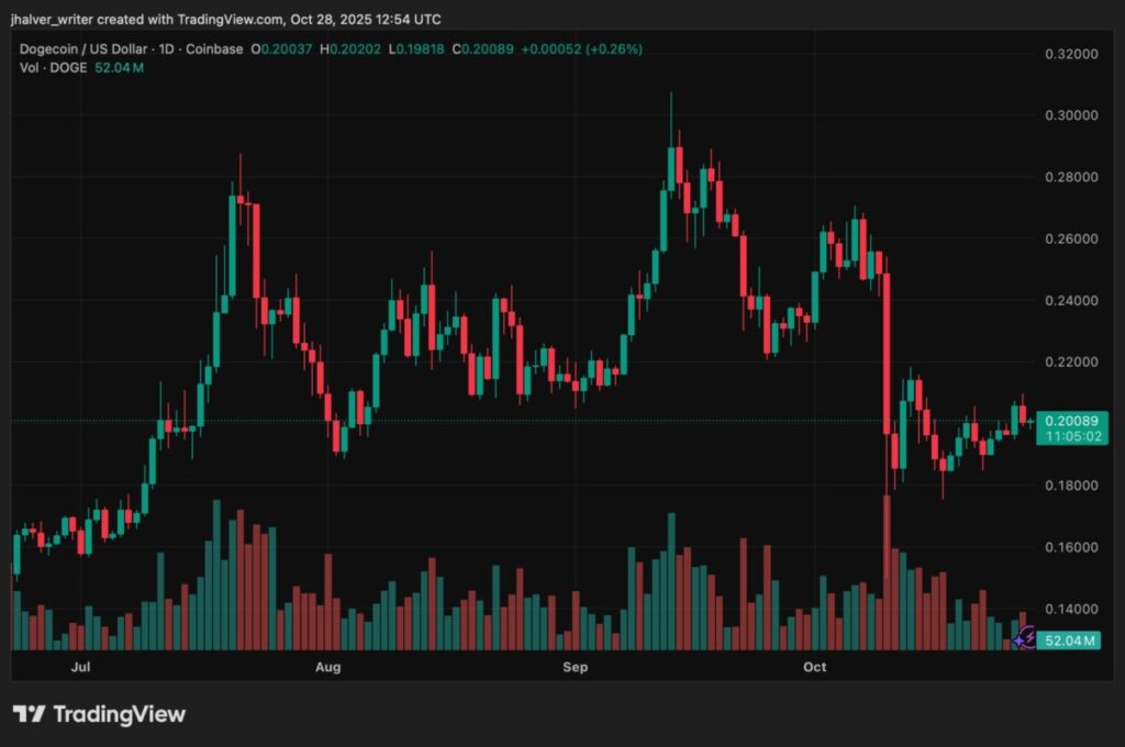 Currently, the Dogecoin (DOGE) price is hovering near $0.20 with a market capitalization of $30.3 billion, still holding above the psychologically important zone but struggling to gain upward momentum. Immediate resistance lies between $0.204 and $0.210, while a firm close below $0.19 could accelerate losses towards $0.18-$0.166.