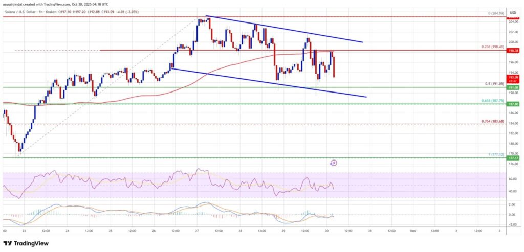 Solana (SOL) declined below the 23.6% Fibonacci retracement level of the upward wave from $177 to $205. Currently, SOL is trading below $195 and the 100-hour simple moving average. There is a descending channel forming with resistance at $200 on the hourly chart of the SOL/USD pair. If SOL manages to break above the $205 resistance zone, this could be the start of a steady rise.