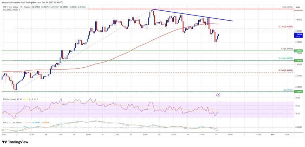 Jakarta, Pintu News – Ripple recently formed a short-term top near $2.69 before starting a downward correction. The price dipped below the $2.65 and $2.62 levels, showing significant fluctuations.