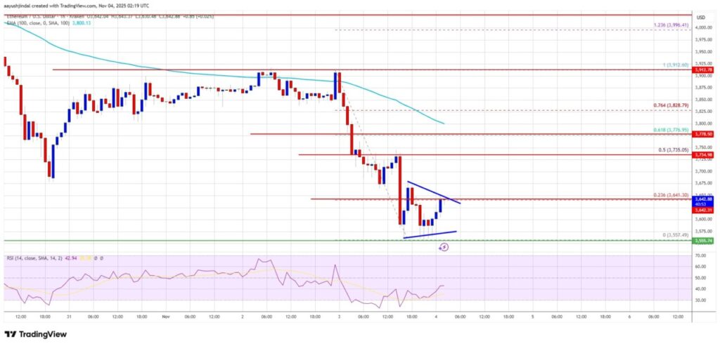 Ethereum (ETH) recently began a significant decline from the positive zone, with the price dropping below $3,880. The decline continued, crossing the $3,800 and $3,750 boundaries, which marked the entry into the bearish zone. The decline accelerated when the price broke below $3,650, and eventually, support emerged near $3,550. Currently, Ethereum (ETH) is trying to consolidate its losses after bottoming out at $3,557.