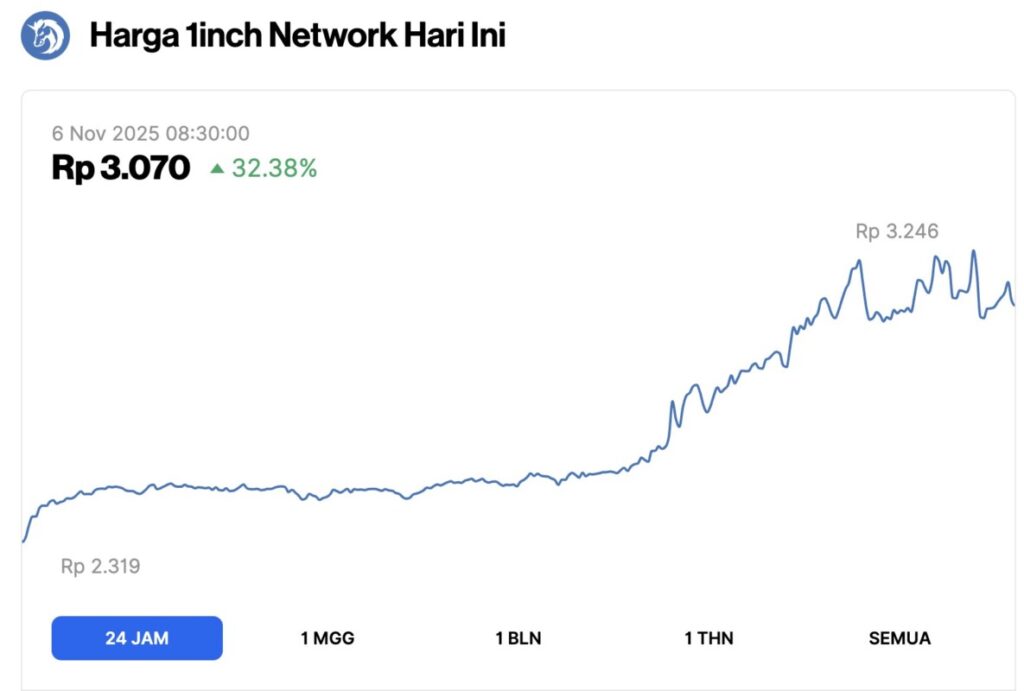 The price chart of 1inch Network shows strong gains in the last 24 hours, with a 32.38% surge to reach IDR3,070 at 08:30. The movement started at levels around IDR2,319 and tended to stabilize at the beginning of the session before bullish momentum began to gradually build.