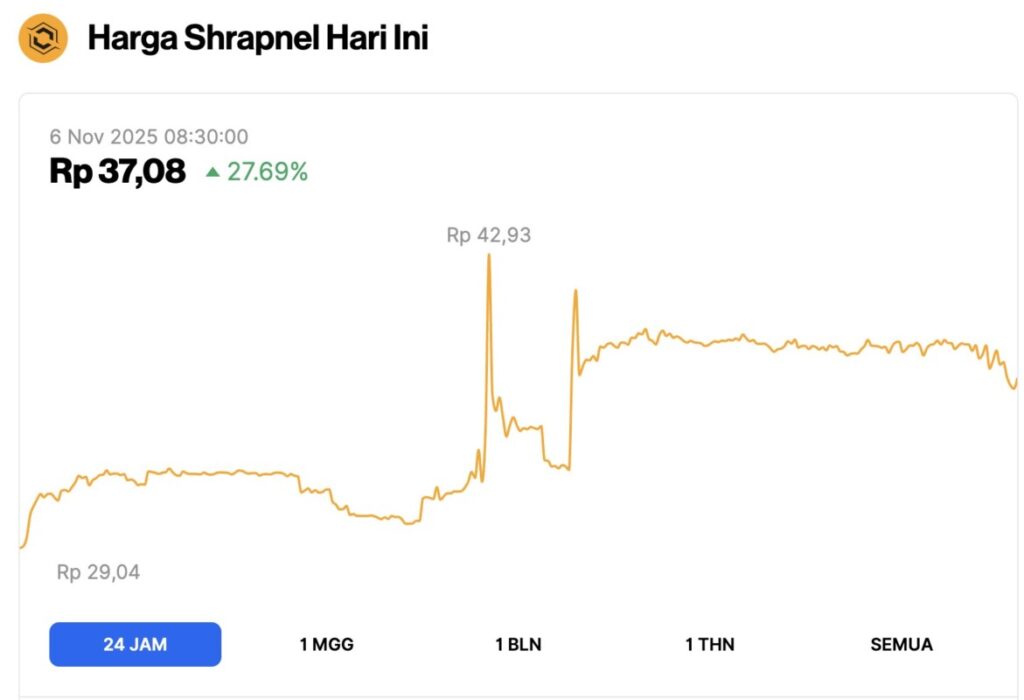 The price chart of Shrapnel in the last 24 hours shows a significant surge of 27.69%, bringing the price to IDR37.08 at 08:30. The price movement started from around IDR29.04 and moved relatively stable before entering a phase of high volatility.