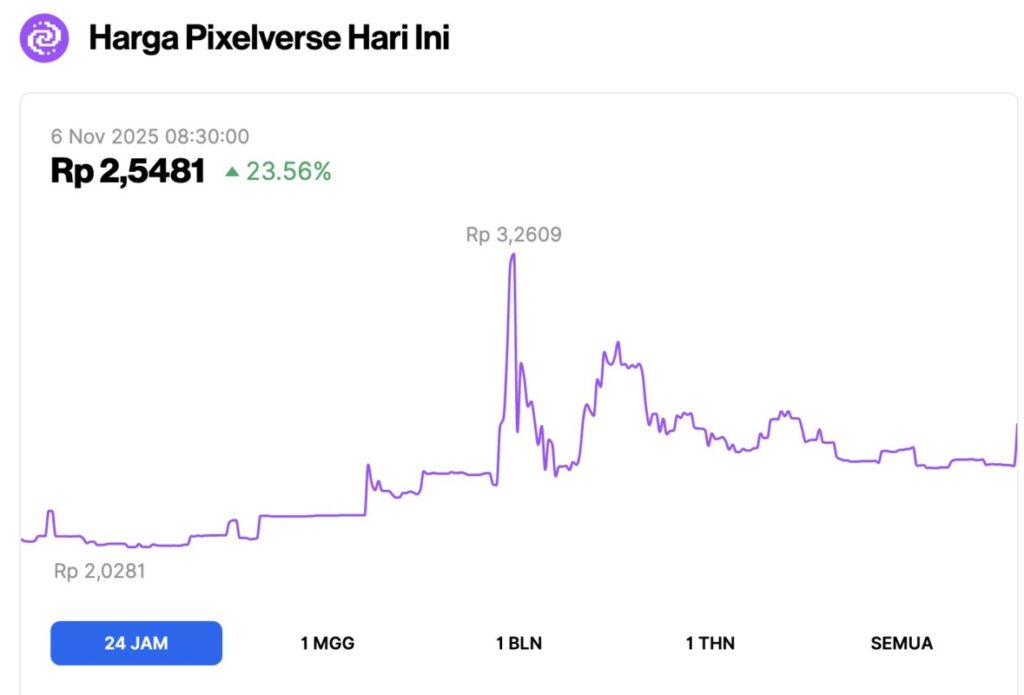 The Pixelverse price chart in the last 24 hours shows a strong increase of 23.56%, bringing the price to IDR2,5481 at 08:30. The price movement started at around IDR2.0281 and stabilized before entering a phase of high volatility.