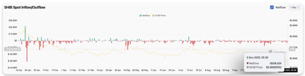 Data from Coinglass shows an outflow of $3.06 million yesterday, followed by an additional $558,600 today. This indicates an active distribution by SHIB holders.