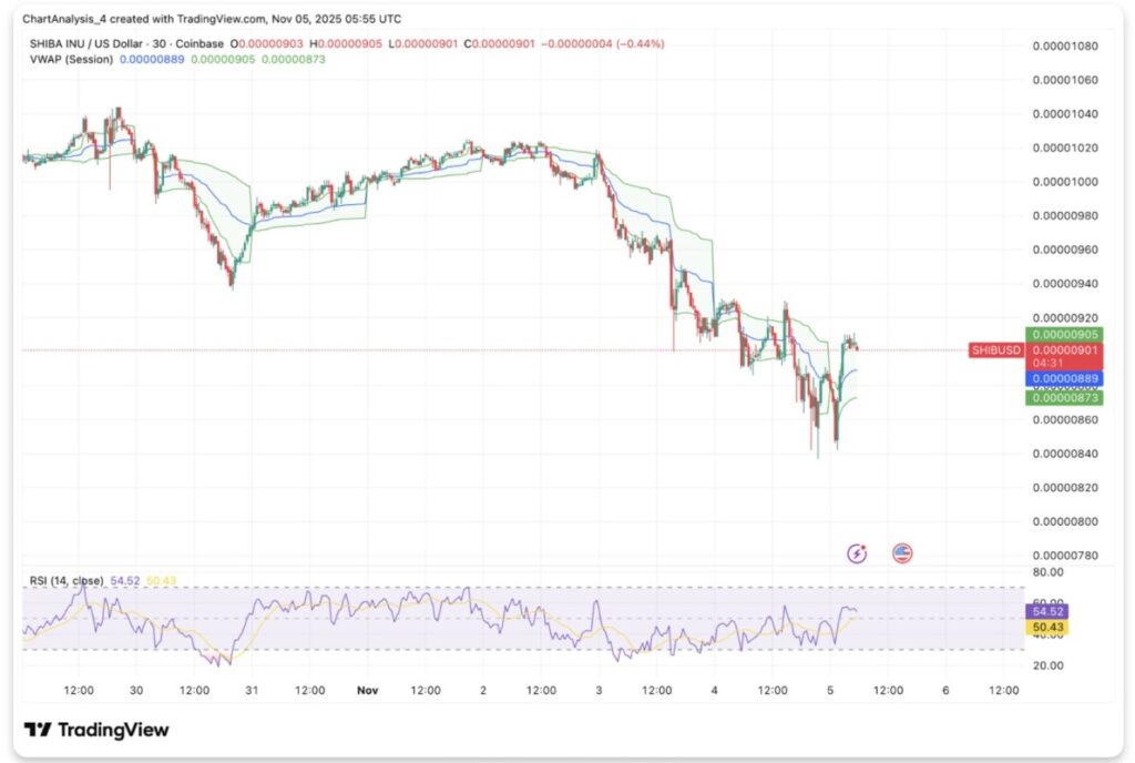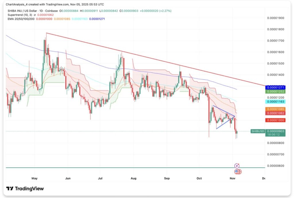 Jakarta, Pintu News – As of November 5, the price of Shiba Inu (SHIB) is trading around $0.00000905, breaking downwards from the consolidation zone of the past few weeks. This decline comes after the price was rejected at the downtrend line, signaling sellers’ dominance in the short term.