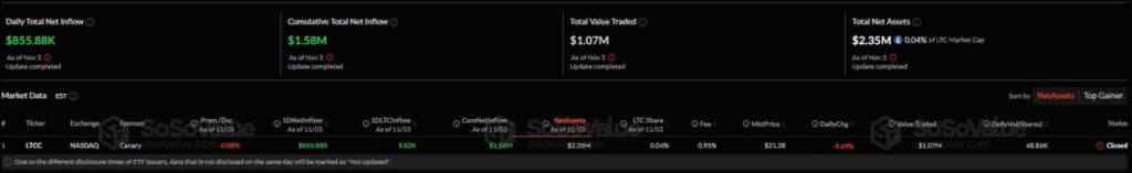 Recently, Litecoin (LTC) caught the attention of institutional and retail investors after an increase in ETF inflows of $855,000 was recorded on November 3rd. This is one of the highest daily totals in recent weeks. This increase signals that there is renewed market confidence in Litecoin (LTC).
