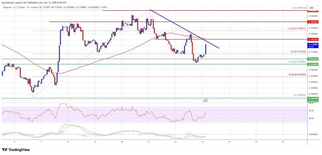 Dogecoin (DOGE) experienced a correction after peaking at $0.1880. The decline took DOGE below the $0.1800 level, but strong support at $0.1680 managed to hold off further declines. Currently, Dogecoin is trying to climb back up and break through the resistance.