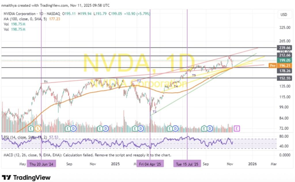 Technically, Nvidia stock is currently moving in an ascending wedge pattern as seen from trend line 2 (T2) and trend line 3 (T3) on the daily chart. The price of NVDA recently touched both trend lines at $212 and $178, where the touch at $178 was also the starting point of the latest rally.