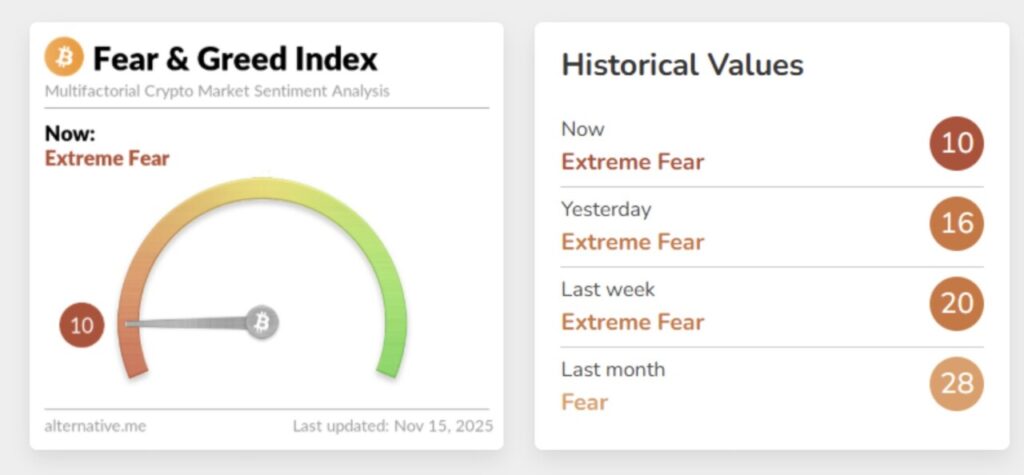 Fear & Greed Index yang saat ini berada di angka 10 mencerminkan tingkat ketakutan ekstrem, sebanding dengan kondisi pada awal dan pertengahan tahun 2022—dua periode yang dikonfirmasi sebagai fase pasar bearish.