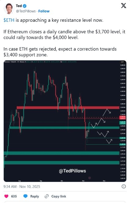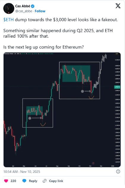 Analyst Ted Pillows states that if ETH manages to break through this resistance, the price has the potential to rise to IDR 66.6 million (USD 4,000). But if not, ETH could correct to IDR 56.6 million (USD 3,400). Meanwhile, Cas Abbe thinks that the previous correction to IDR 50 million (USD 3,000) was a “fakeout,” referring to the historical pattern in the second quarter of 2025 followed by a 100% price spike.