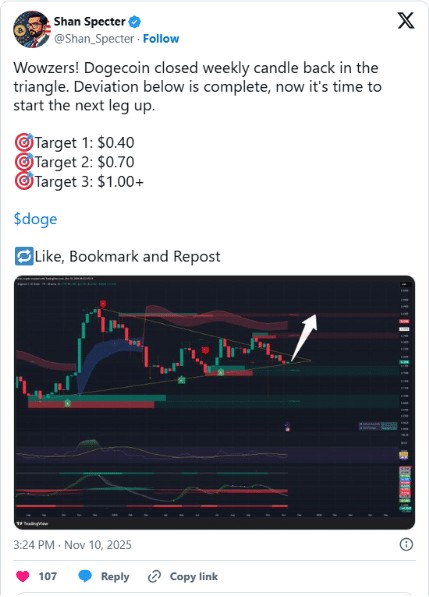 Shan Specter projects DOGE targets of up to IDR6,667, IDR11,668, and even IDR16,669 (USD 0.40, 0.70, and 1.00 respectively) if the symmetrical triangle pattern is confirmed. On the other hand, Osemka8 analysts think DOGE could replicate the 2017 and 2021 spikes with ambitious targets of up to IDR51,670 (USD 3.10).