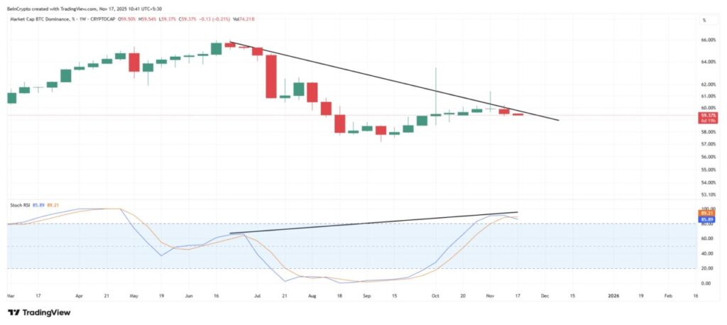 Dominasi Bitcoin (Bitcoin dominance) telah menurun selama beberapa minggu terakhir, menciptakan divergensi bearish yang jelas dengan indikator Stochastic RSI. Saat ini, dominasi Bitcoin berada di angka 59,37%, turun dari 65,71% pada bulan Juni.