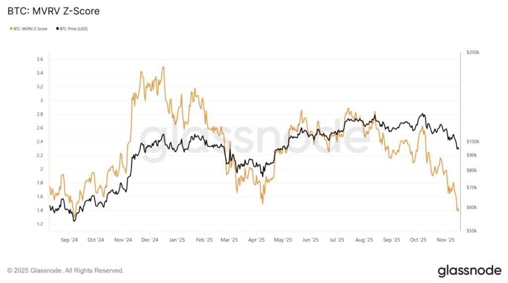 Selain itu, skor MVRV Z-Score Bitcoin telah turun ke level terendah dalam 14 bulan terakhir, yang mengindikasikan bahwa aset ini dinilai undervalued (di bawah nilai wajarnya) dibandingkan dengan rata-rata historis. Metrik ini digunakan untuk menilai apakah Bitcoin diperdagangkan di atas atau di bawah nilai wajarnya.