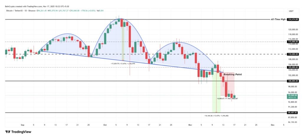 Bitcoin sempat diperdagangkan di angka $95.040 pada 17 November, berada di sekitar level psikologis yang krusial. Penurunan harga semakin tajam setelah BTC menembus pola head and shoulders pada pekan lalu — sebuah sinyal teknikal yang memperkuat ekspektasi bearish di pasar.