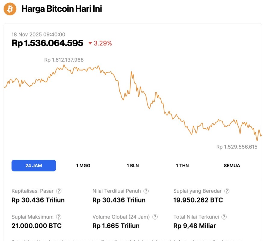 Pada 18 November 2025, harga Bitcoin tercatat berada di level $91,313 atau setara dengan Rp1.536.064.595, mengalami penurunan 3,29% dalam 24 jam terakhir. Sepanjang periode ini, BTC menyentuh level terendahnya di Rp1.529.556.615 dan harga tertingginya di Rp 1.612.137.968.