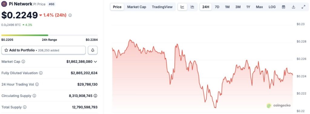 Kapitalisasi pasar Pi Network tercatat sebesar $1,86 miliar, dengan valuasi penuh terdilusi mencapai $2,86 miliar, mencerminkan potensi pertumbuhan nilai apabila seluruh suplai beredar. Aktivitas perdagangan harian relatif aktif, dengan volume transaksi 24 jam sebesar $29,78 juta, menandakan adanya pergerakan yang cukup dinamis meski dalam tren menurun.