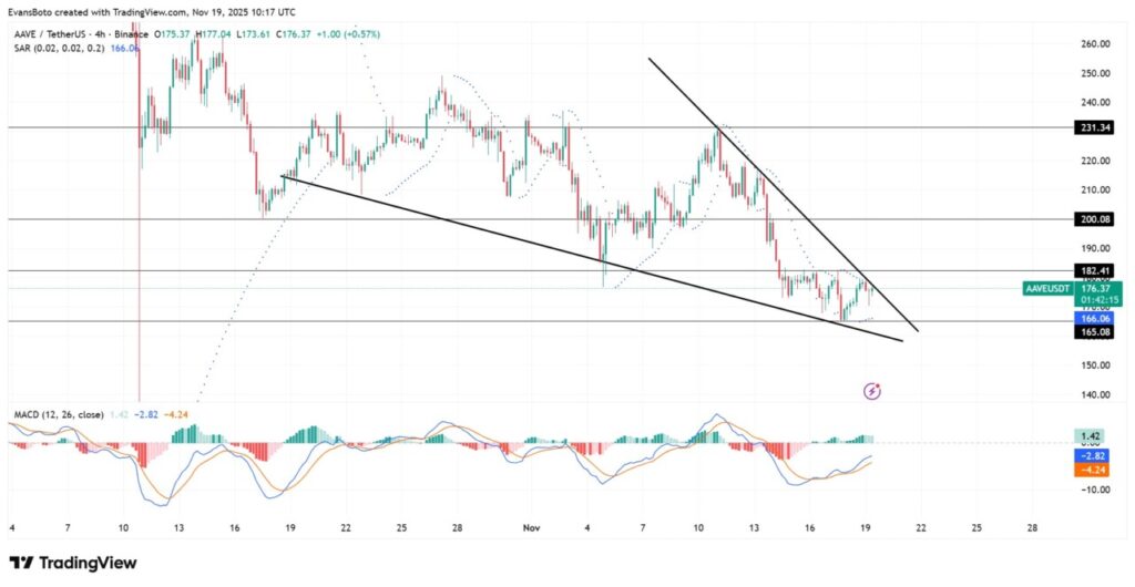 AMBCrypto reported that AAVE’s technical structure is currently forming a falling wedge pattern with the price approaching the upper limit of the pattern. Every time the price touched the $165.08 support level, there was a consistent buying reaction.