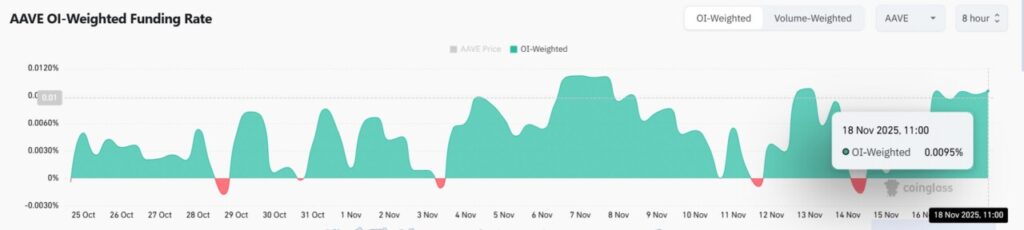 Data from CoinGlass noted that the AAVE funding rate remained positive at around 0.0095%, reflecting the dominant long position among derivatives traders. This positioning is in line with the uptrend in the spot market.