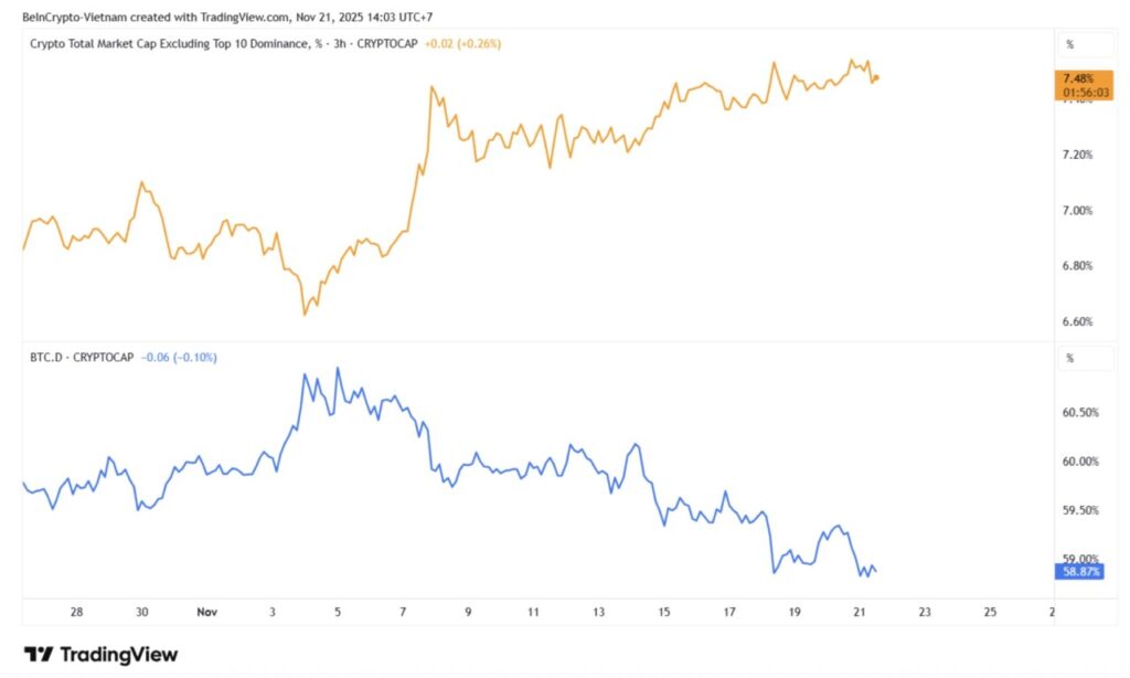 Grafik menunjukkan bahwa pada bulan November, OTHERS.D meningkat dari 6,6% menjadi 7,4%, sementara BTC.D justru turun dari 61% ke 58,8%.