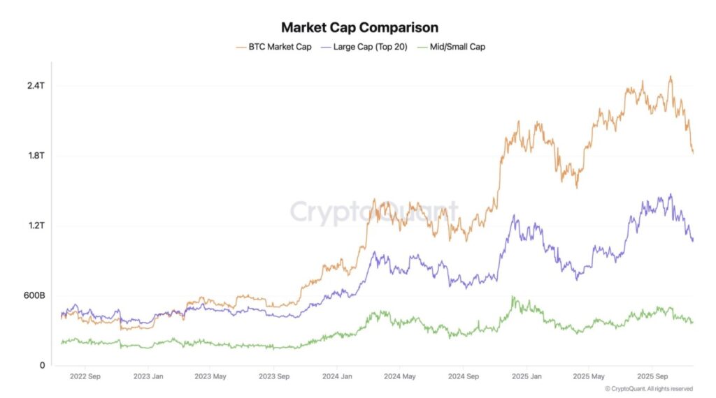 Laporan dari CryptoQuant membandingkan kinerja kapitalisasi pasar Bitcoin , altcoin kapitalisasi besar, serta altcoin kapitalisasi menengah dan kecil. Hasilnya menunjukkan bahwa aset dengan kapitalisasi lebih rendah justru menunjukkan ketahanan yang signifikan.