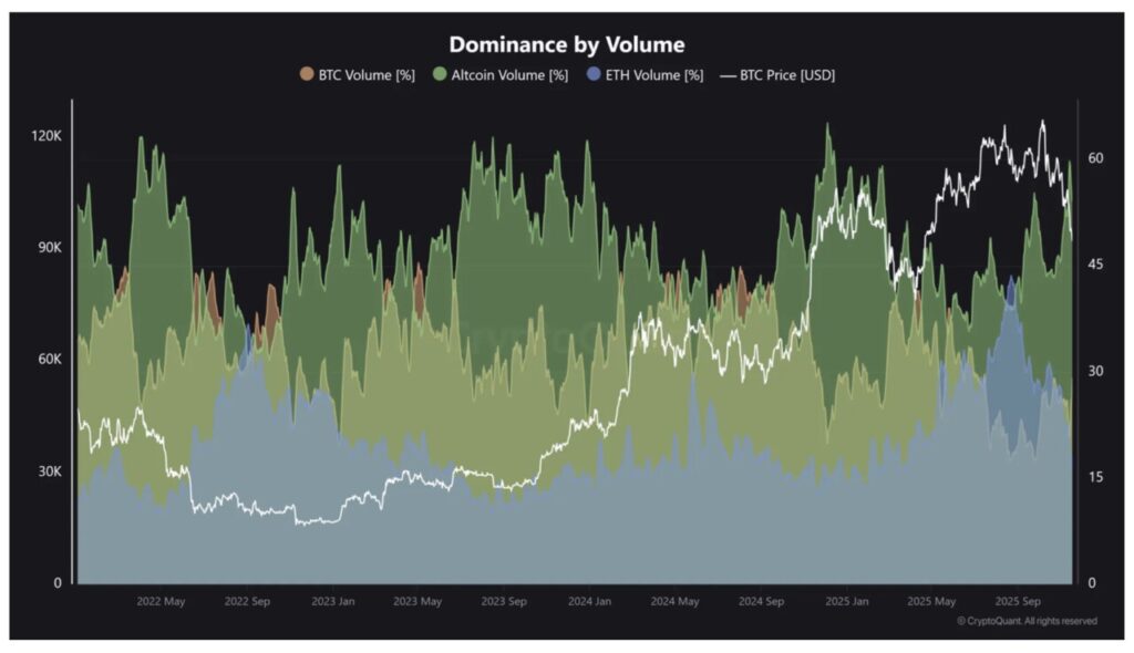 Data dari Binance juga menunjukkan bahwa saat ini 60% volume perdagangan berasal dari altcoin — angka tertinggi sejak awal tahun 2025. Hal ini menunjukkan adanya peningkatan minat dan aktivitas di pasar altcoin, meski sentimen umum pasar masih diliputi ketakutan ekstrem.