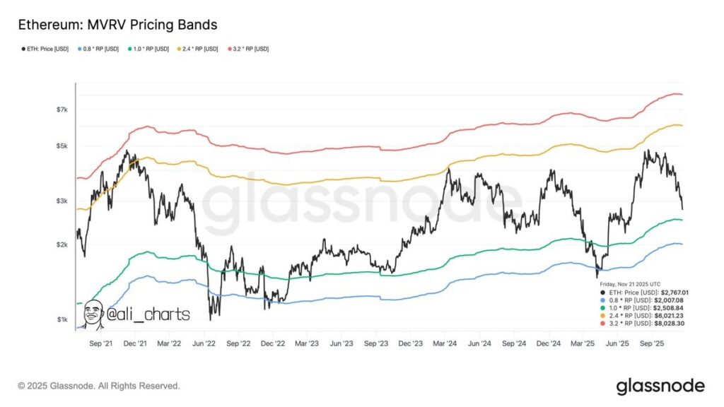 Ali Martinez, in a post on X on November 22, shared on-chain data suggesting that Ethereum (ETH) may be about to hit a local bottom at around $2,000. MVRV Pricing Bands, which are valuation bands derived from the ratio of MVRV and Realized Price (RP), are designed to show when cryptocurrencies like ETH are undervalued, fairly valued, or overvalued based on an on-chain investor’s cost basis.