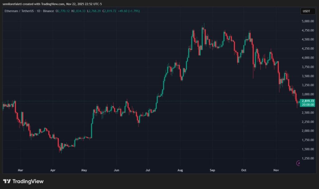 Jakarta, Pintu News – Ethereum, as the largest altcoin, has experienced a sharp decline over the past month, losing 27.63% in value. Currently, Ethereum is trading at around $2,800, a far cry from its last cycle peak of $4,800. With the continued price drop triggering a wave of liquidation, analyst Ali Martinez gives a prediction of the upcoming market bottom.